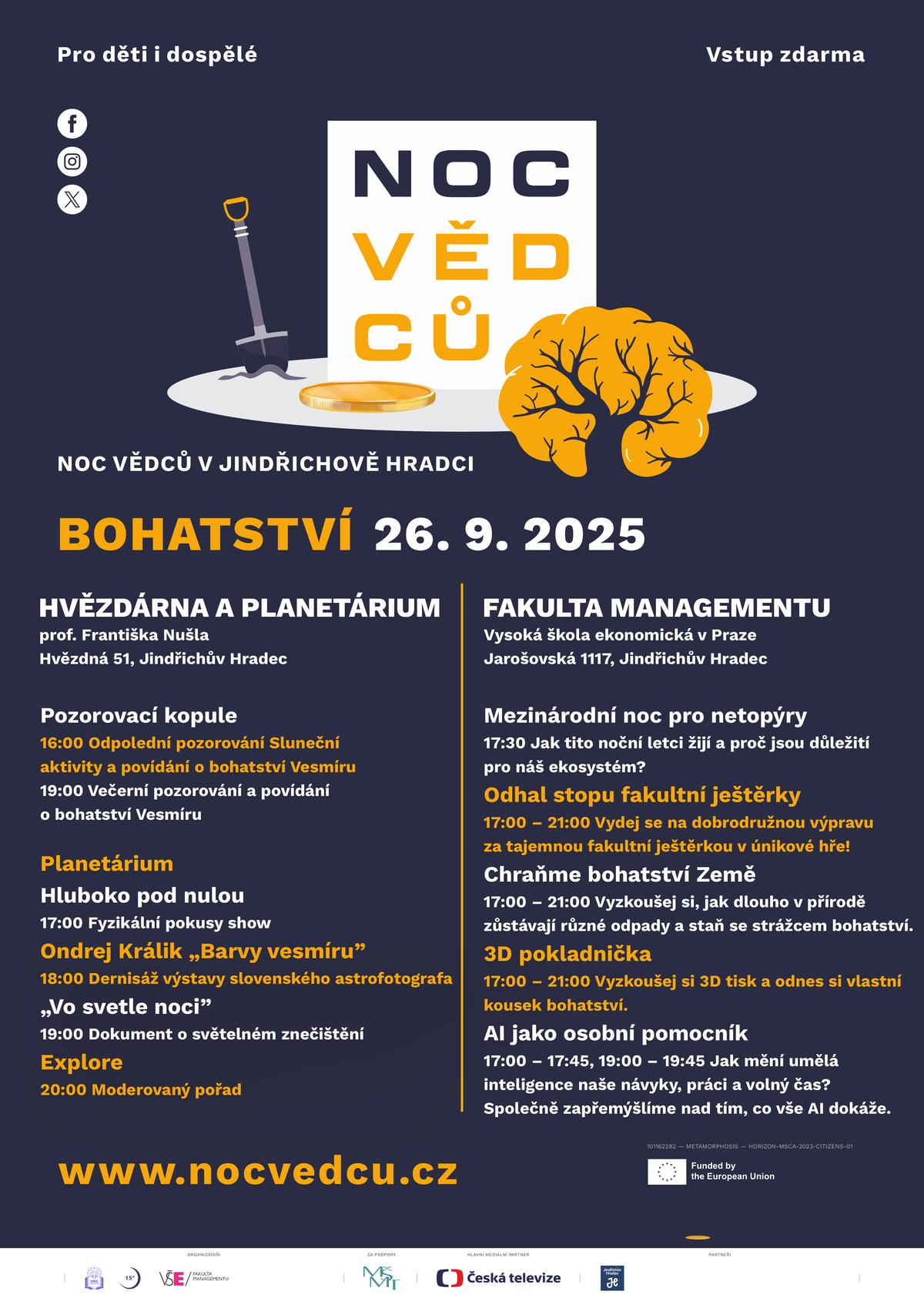 Účastí na akci Noc vědy berete na vědomí, že v jejím průběhu mohou být pořizovány fotografie a audiovizuální záznamy určené k dokumentačním a propagačním účelům akce. Tyto záznamy mohou být následně zveřejněny v médiích, na webových stránkách a sociálních sítích pořadatelů. Pokud si nepřejete být zachyceni nebo zveřejněni, můžete pořadatele na místě požádat o nezahrnutí do záznamu nebo následně uplatnit svá práva dle GDPR (např. požádat o výmaz či vznést námitku) prostřednictvím kontaktu: media@nocvedcu.cz.